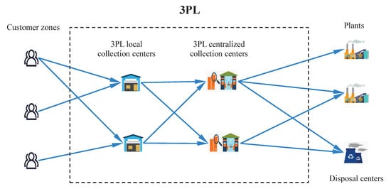 In recent decades, the development of humanity has led to unfavorable climate changes and natural disasters [1]. More attention has been placed on sustainability development to prompt socioeconomic development in line with ecological constraints [2]. In recent two decades, due to increasing environmental concerns and economic benefits, many companies have focused on reverse logistics [3]. Reverse logistics can be described as the process of collecting returned products from the customers to the manufacturers to capture appropriate disposal activities [4]. However, reverse logistics operations are extremely complicated and are out of companies’ technological scopes. Due to the uncertainties surrounding the quantity and time of product returns, reverse logistics usually require specialized infrastructure and high handling costs and time [5]. Currently, many companies have inefficient processes for returned products. In addition, the implementations of return operations require high investments in equipment, recovery processes, information systems, etc., which are not core capacities of manufacturers [6]. In contrast, 3PL can save a substantial amount of costs associated with product returns through their complete RL networks, advanced equipment, substantial operational experiences, and required information systems [7]. Therefore, more companies have begun to outsource their reverse logistics to 3PL providers. Reverse logistics network design, as one of the most important strategic decision problems, plays a key role in the effective operation of reverse logistics. Consequently, it is significant for 3PL providers to design an efficient reverse logistics network for their clients.