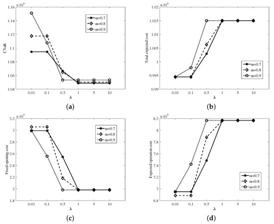 The objective function (21) is to minimize the total cost and VaR, where f is an auxiliary variable, which represents the VaR value at the confidence level . Constraints (22) and (23) require that the probability that the total cost in scenario s does not exceed f and is not less than , where N is a large and positive number. Constraint (24) enforces the binary restrictions on the auxiliary variable , which is equal to 1 if and 0 otherwise.