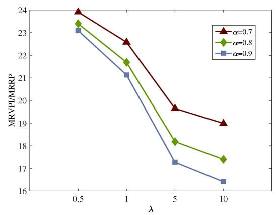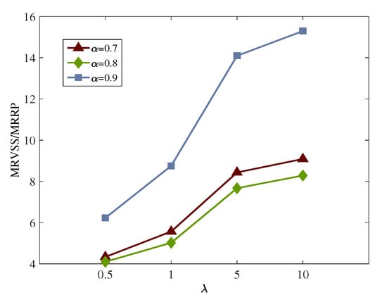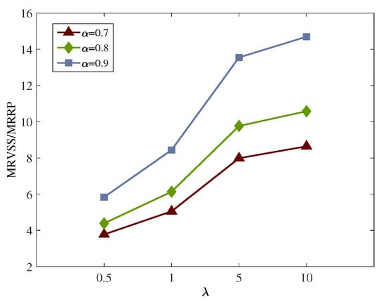 Figure 4 and Figure 5 illustrate the effects of risk parameters of the ratios and of the mean VaR modeling approach. As shown in Figure 4, for a fixed , the ratio increases when varies from 0.5 to 10. However, the ratio decreases as or increases, as seen in Figure 5. One can see in Figure 5 that the gap between the ratios under different tends to widen as increases. Table 9 shows the summary of the stochastic measures for the mean VaR modeling approach under different risk parameters, and .