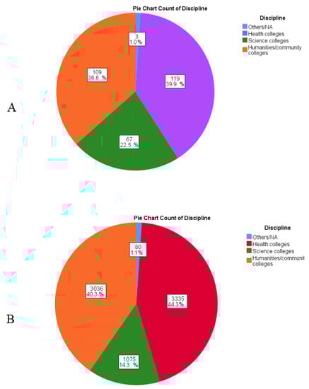 The graphical distribution of (A) faculty and (B) student responses based on scientific disciplines.