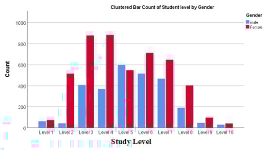 The study covered seven consecutive semesters from Fall 2016 to Fall 2019. The study demographics showed that 60% of the total participating faculty members and 64% of students were females (Figure 1). The study showed a relative increment in the number of participating faculty and students starting from the Spring 2018 semester (Figure 2). There was a minor drop in the semester of Fall 2019, which might correspond to the beginning of the COVID-19 pandemic. The study involved wide distribution among different disciplines covering up to 18 colleges within the university. Interestingly, the majority of participating faculty members (40%) and students (44%) belong to health colleges (Figure 3). In addition, the majority of participating faculty members (45%) were assistant professors (Figure 4). Interestingly, the study covered wide study levels of bachelor degrees ranging from levels 1–10 with a peak of participants at levels 3 and 4 (Figure 5). The Students’ GPA ranged from 1 to 5 with an average of 4.1 ± 0.6 (n = 3304).