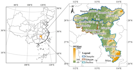 Geographic location of Changsha–Zhuzhou–Xiangtan urban agglomeration (1–11 stands for Furong District, Tianxin District, Yuelu District, Kaifu District, Yuhua District, Hetang District, Lousong District, Shifeng District, Tianyuan District, Yuhu District, and Yuetang district, respectively.).