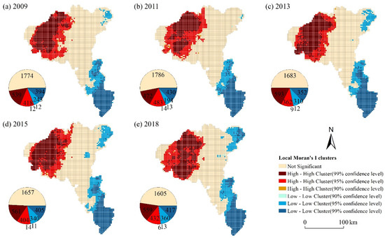 Local autocorrelation of PM2.5 concentration in (a) 2009, (b) 2011, (c) 2013, (d) 2015, and (e) 2018. The pie chart at the lower left corner shows the annual area proportion of clusters.
