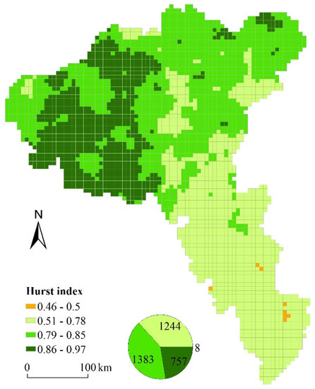 On the basis of the PM2.5 concentration data of the study area from 2009 to 2018, each grid Hurst index is calculated with the aid of Equation (6–10). Combined with the characteristics of the Hurst index and natural breakpoint method, the results are classified in Figure 6. It can be noted that the Hurst index of each area of this region ranges from 0.46 to 0.97. The regional difference is obvious. The high-value areas are mainly distributed in Xiangtan City and Changsha City. The low value areas are mainly distributed in Zhuzhou City, as well as in the central and eastern parts of Changsha City. The areas with a Hurst index greater than 0.5 account for 99.76%, indicating that the PM2.5 concentration in most areas is positively persistent. There is an obvious Hurst phenomenon, that is, the future PM2.5 concentration in most areas of this region is very likely to continue the trend of a gradual decline in PM2.5 concentration which has been observed in the past [52]. It should be noted that the Hurst index of 0.24% of the areas is less than 0.5. These are mainly distributed in some rural areas of Chaling County and Yanling County, indicating that the non-point source pollution caused by agricultural development will lead to the future evolution of PM2.5 concentration in these areas. The future trend is contrary to the continuous decline in PM2.5 concentration in the past.