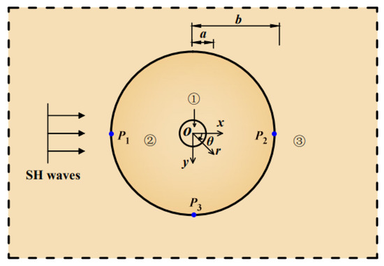 The two-dimensional model studied in this paper is shown in Figure 1. It represents a cylindrical inclusion with radius b in a full space. The inclusion is composed of two parts defined as region ① for r < a and region ② for a ≤ r ≤ b, respectively. It is assumed that the materials of the core region ① of the inclusion and the full space denoted as region ③ where the inclusion is located are both elastic, homogeneous and isotropic with constant density ρj, shear modulus µj and shear wave velocity cj (j = 1 or 3, indicating region ① or region ③). In contrast, the material in the region ② of the inclusion is elastic, isotropic but inhomogeneous with a continuously varying rigidity in the radial direction. To facilitate the analytical solution, the shear modulus μ2 and shear wave velocity c2 are assumed as power functions of radial distance r and the mass density ρ2 remains constant. The continuously varying rigidity profile of the inhomogeneous region of the inclusion can be expressed as follows: