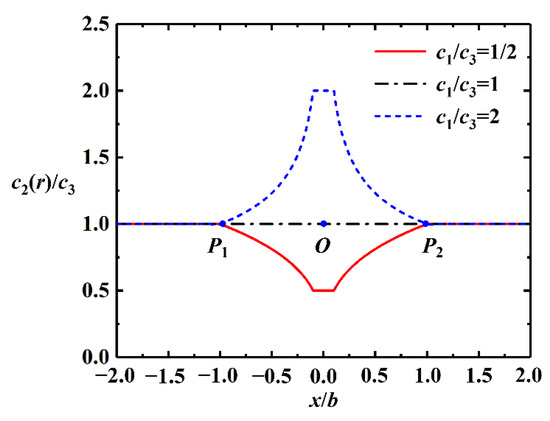 To focus on the effect of continuous change of wave velocity across the interfaces among the three regions, it is assumed that c2(a) = c1 and c2(b) = c3. The variation of the wave velocity along the x-axis in the cross section at y = 0 of the model is shown in Figure 2. One can see that the wave velocity profile of the inhomogeneous inclusion is dependent on the key parameter of c1/c3.