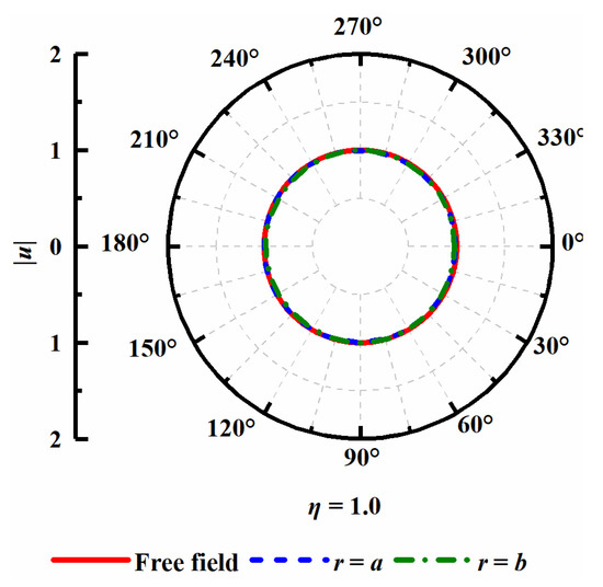 Setting the parameters of the radially inhomogeneous cylindrical inclusion model in this paper as β = 0.01, ρ1/ρ3 = ρ2/ρ3 = 1, c1/c3 = 1, the model can be approximately degenerated into a homogeneous free field model in a full space. The displacement amplitudes |u| at the inner surface (r = a) and the outer surface (r = b) of the inclusion are calculated to be approximately 1, as shown in Figure 4. This agreement with that predicted by the exact solution for a free field in a full space verifies the accuracy of the method in this paper as well.