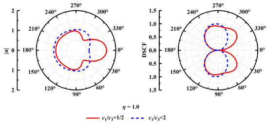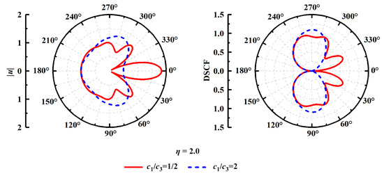 To reveal the influence of the inhomogeneous rigidity or wave velocity profile on the seismic response of the inclusion, the surface displacement amplitudes as well as the dynamic stress concentration factors of both soft and hard inclusions at different dimensionless frequencies are calculated, as shown in Figure 5, Figure 6 and Figure 7. The dimensionless parameters in the calculation model are set as a/b = 0.1, ρ1/ρ3 = ρ2/ρ3 = 1, and c2 (b)/c3 = 1. For the soft inclusion, the wave velocity in the region ① is set as c1/c3 = c2 (a)/c3 = 0.5, while c1/c3 = c2 (a)/c3 =2 is taken for the hard inclusion.
