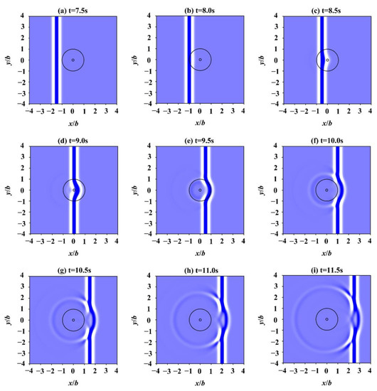 Figure 8 shows the propagation process of incident Ricker wavelet in a full space with a soft inclusion. It is set that the Ricker wavelet reaches the soft inclusion at t = 7.5 s (Figure 8a). When the Ricker wavelet enters the soft inclusion, the wave in the soft inclusion gradually lags behind the wave in the full space due to the difference in wave velocity (c2 < c3). Therefore, the overall wavefront in the soft inclusion becomes concave and curved backward as shown in Figure 8b–e. When the Ricker wavelet passes through the soft core of the inclusion, the core acts as a secondary wave source and generates a scattered wave that begins to propagate outward as shown in Figure 8f. A superposition between the scattered wave and the direct wave can be observed in Figure 8g–i.