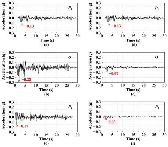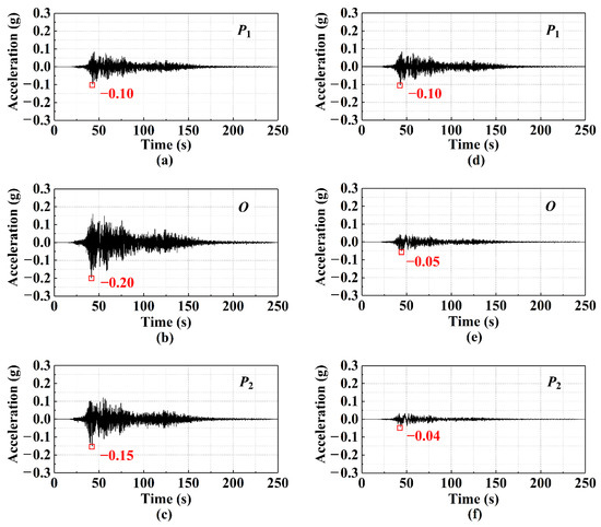 Similarly, Figure 14 shows the acceleration time histories of three positions of soft (Figure 14a–c) and hard (Figure 14d–f) inclusions under El Centro wave. It can be found that the PGA at positions P1, O and P2 of the soft inclusion is 1.3, 2.8 and 1.7 times that of the original El Centro wave (Figure 10a), while the PGA at positions P1, O and P2 of the hard inclusion is 1.3, 0.7 and 0.3 times that of the original wave. Overall, the amplification or reduction effect on the incident El Centro wave is stronger than that on Deyang (NS) wave due to the difference in the frequency content between the two incident waves.