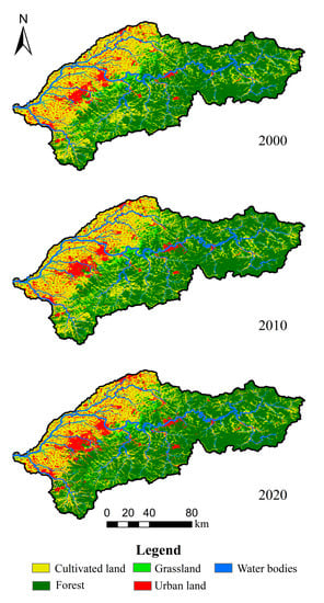 Land use changes during the period 2000 to 2020 in the Taizi River.