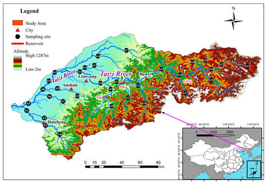 The Taizi River (40°29′–41°39′ N, 122°25′–124°55′ E), one of the two largest tributaries of the Liaohe River, is located in Liaoning province of northeast China, with a drainage area of approximately 13,880 km2 (Figure 2). The river originates in the Changbai Mountains and flows through important cities such as Benxi city, Liaoyang city, Anshan city and Haicheng city. The Taizi River is a typical temperate river with a length of 413 km. The annual average precipitation is 778.1 mm, and most of the precipitation occurred in the flood season from June to September. The average annual temperature ranges from 2.27 °C to 9.99 °C along the upstream to downstream axis, with a substantial temperature difference between winter (−9~−17 °C) and summer (22~24 °C). The Taizi River catchment has been spatially divided into three zones (upstream, midstream and downstream) along the longitudinal gradient based on biological and environmental data [41]. The obvious environmental interference gradient was observed in this basin. For example, three large reservoirs—Guanyinge (GYG) reservoir, Shenwo (SW) reservoir and Tanghe (TH) reservoir—were constructed in the last century (Figure 2). The geomorphological features of the basin include the upper–middle highland vegetation region and the lower-plain agricultural region. The highland region has a high percentage of natural vegetation cover with little human disturbance, whereas the plain region comprises mainly agricultural and urban land (Figure 1).