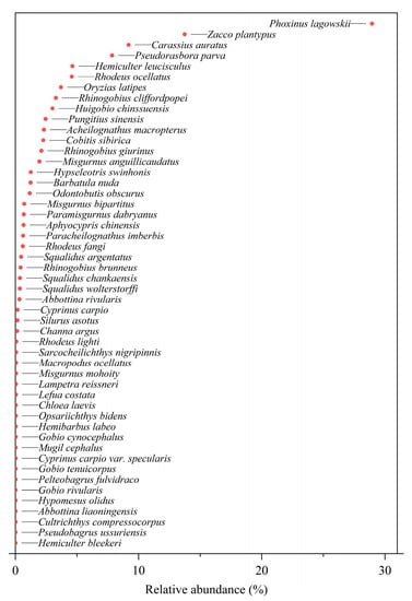 A total of 9021 specimens belonging to 7 orders, 13 families and 50 species were captured during the study period (Table S1, Figure 3). The total species richness index and Shannon–Wiener diversity index were 5.29 and 2.59, respectively (Figure 4). The most diverse family was Cypriniformes with 34 species (66.67% of the total species), followed by Perciformes (9 species); Siluriformes (3 species); and Salmoniformes, Gasterosteiformes, Petromyzoniformes and Cyprinodontiformes (one species for each). The fish assemblage in the whole Taizi River basin was dominated by Phoxinus lagowskii (Ni% = 28.95%), Zacco platypus (Ni% = 13.74%), Carassius auratus (Ni% = 9.19%) and Pseudorasbora parva (Ni% = 7.85%), exhibiting high frequencies of occurrence (63.64%~96.97%). The common species were Hemiculter leucisculus (Ni% = 4.63%), Rhodeus ocellatus (Ni% = 4.58%), Oryzias latipes (Ni% = 3.70%), Rhinogobius cliffordpopei (Ni% = 3.29%), Huigobio chinssuensis (Ni% = 3.01%), Pungitius sinensis (Ni% = 2.45%), Acheilognathus macropterus (Ni% = 2.31%), Cobitis sibirica (Ni% = 2.27%) and Rhinogobius giurinus (Ni% = 2.11%), exhibiting moderate frequencies of occurrence (27.27%~54.55%). The remaining specimens (11.97% relative abundance) were classified into the rare species involving 37 species, and these species showed low relative abundance (less than 2.00%). Moreover, according to the Chinese Red List [49], Least Concern and Data Deficient fish species were the most common in abundance, accounting for 98.0% of the total. Only one vulnerable species, Lampetra reissneri, was collected in this study.