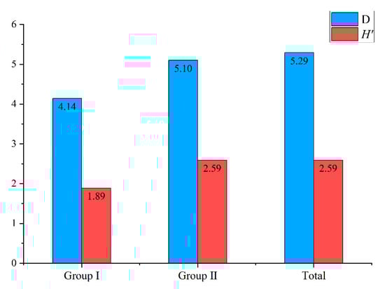 Spatial variances of species diversity for different groups. H’ and D represent the Shannon–Wiener diversity index and the Margalef species richness index, respectively.