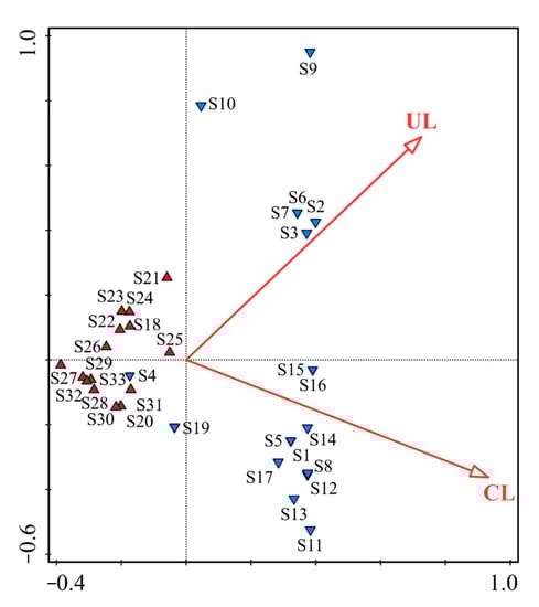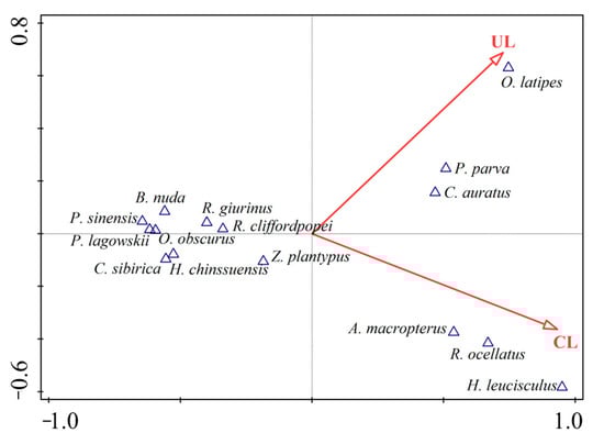 The ordination plot indicates that the tolerant species (e.g., C. auratus, P. parva, R. ocellatus, H. leucisculus, O. latipes and A. macropterus), dominant in the downstream reaches, preferred habitats with high cultivated and urban land coverage. In contrast, the intolerant fish species (e.g., P. lagowskii, Z. plantypus, H. chinssuensis, P. sinensis, C. sibirica, O. obscurus and B. nuda), prevailing in the middle–upper reaches, preferred habitats with low cultivated and urban land coverage (Figure 7 and Figure 8).