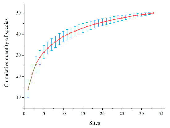 Fish species accumulative plot as an average of 999 curves based on different random orders of the sampling sites extracted (number of sites = 33). Vertical bars represent standard deviation.