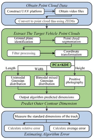 - To address the characteristics of the large length–width ratios and symmetries associated with truck bodies, this study proposes a method for calculating length and width using the principal component analysis and the Gaussian kernel density estimation.