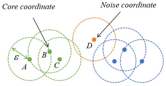 In cosmology, the FoF algorithm is used to identify the objects of interest and the quantitative structure in particle systems. It is a simple clustering algorithm that checks the distance between particles [25]. Figure 4 shows the principle of the FoF clustering algorithm. If the distance between two particles is less than the threshold ε, the FoF defines them as friends. For example, in Figure 4, A and B are friends, and B and C are friends, but A and C are not friends. Two particles are friends of friends if they can be reached by traversing the transfer closure created by the friend relationship. If a particle has no friends, it is classified as being noise. For example, in Figure 4, A and C are friends of friends through B, and D is a noise point. To compute the clusters, the algorithm computes the passing closure for each unvisited particle’s friend relationship. All the particles in the closure are marked as visited and are linked as a single cluster.