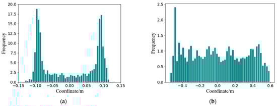 Frequency distribution histogram of point cloud projection: (a) width direction; (b) length direction.