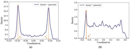 To better illustrate how to solve for length and width using kernel density estimation, we plot the Gaussian kernel density estimation of point cloud projections for a dataset based on the bandwidth selected using cross-validation, as shown in Figure 6. In the width direction, the points corresponding to the peaks are solved based on the bimodal mixed Gaussian distribution. The distance between the two peaks corresponding to points and is the vehicle width. The solution equation is as follows: