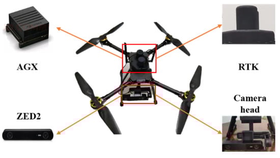 A customizable industrial-grade quadcopter UAV was used to carry the ZED2 binocular camera. The binocular camera was connected to the UAV using a digitally encoded gimbal. The ZED2 was connected to an NVIDIA AGX Xavier single-board computer that provided the embedded system for processing the raw data acquired by the ZED2. A wireless gateway device was used to establish a two-way communication link between the client (ground station computer) and the server (AGX). Figure 7 shows the completed UAV platform. The client used NoMachine software to remotely control the server to acquire and process the data.