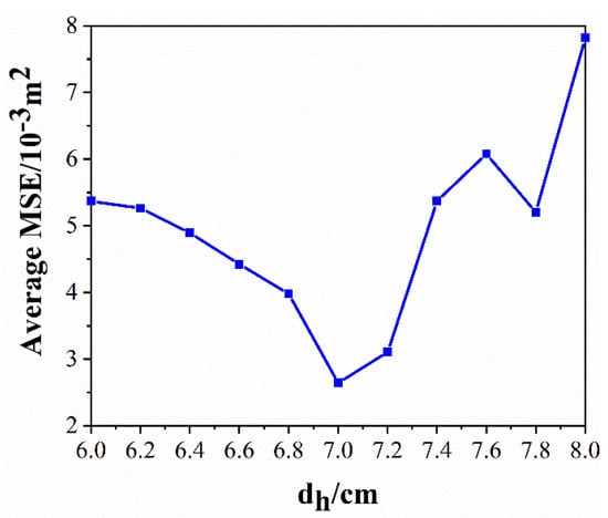 During the experiment, the algorithm parameters were set according to the characteristics of the environment and the density characteristics of the reconstructed point clouds. When identifying the ground plane, the MSE function was used to determine the optimal ground thickness; the ground thickness was 3–4 times the resolution of the point clouds. Therefore, we set eleven values ranging from 0.06 to 0.08 m in steps of 0.002 m; those eleven values were used to predict the outer contour dimensions for each of the six training model vehicles. The MSE was calculated for each, and the average was calculated for the six model vehicles. Figure 9 shows the average MSE of the six model vehicles; the value corresponding to the minimum average MSE was selected as the best value for the ground thickness. This optimal value was 7 cm.