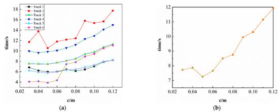 (a) Variation in measurement time with the distance threshold for each vehicle; (b) variation in average measurement time with the distance threshold.