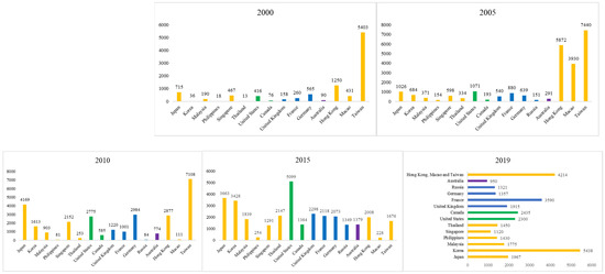 In fact, the “Tour of Qinghai Lake” directly led to the obvious globalization of urban sports activities. The study constructed a resource map of Hong Kong, Macao, Taiwan, and overseas tourist sources in Xining in 2000, 2005, 2010, 2015, and 2019 (Figure 2). Since 2000, the number of tourists from Hong Kong, Macao, Taiwan, and overseas in Xining has been increasing and under the influence of factors such as geographical proximity and cultural similarity, the source of tourists is mainly from Asian countries/regions. For example, Japanese and South Korean tourists have always been in Xining. The city is the main source of tourists for inbound tourism and the number of tourists has been increasing with the growth of the year. The combined market share of tourists from the two countries is relatively stable, at about 20%. However, although tourists from Hong Kong, Macao, and Taiwan are still the main force, their proportion has dropped significantly year by year, from 70% in 2000 to about 11% in 2019. However, the number of tourists from Hong Kong, Macao, and Taiwan has not decreased in absolute numbers. This is mainly due to the gradual increase in the total number of tourists from Hong Kong, Macao, Taiwan, and overseas in Xining City, especially the significant increase in the number of tourists from outside Hong Kong, Macao, and Taiwan, which leads to a decrease in its proportion. The market share of tourists from the Americas and European countries has increased year by year. For example, in 2000, the number of tourists from European countries was less than 1000 and, in 2005 and 2019, the number of tourists increased to 2209 and 8183, respectively, except for developed countries with relatively high economic levels such as France, Singapore, and Australia. In addition, the proportion of tourists from other European countries is increasing, accounting for about one-fifth of the total number of tourists from Hong Kong, Macao, Taiwan, and overseas in Xining in 2019. This is related to the fact that the participating teams are mainly from European countries and the athletes and their teams or relatives come to Xining City, which promotes business travel and foreign exchange income, forming a positive promotion effect [53]. From the perspective of the market structure of Hong Kong, Macao, Taiwan, and overseas tourists (Table 2), the development of tourism globalization in Xining shows a trend of decentralized development, that is, the first source of tourists from Hong Kong, Macao, Taiwan, and overseas tourists in Xining is less and less the phenomenon of the top agglomeration. For example, the largest market in 2000, 2005, and 2010 was Taiwan, in 2015 the United States, and in 2019 South Korea; although the first source countries/regions of Hong Kong, Macao, Taiwan, and overseas tourists are constantly changing, except in 2000, Xining. The ratio of the first country/region as the source of tourists from Hong Kong, Macao, Taiwan, and overseas tourists to the number of tourists in the second country/region remains at around 1.5, which is a low first place distribution; since 2000, the number of tourists from Hong Kong, Macao, Taiwan, and overseas tourists in Xining. The source market fragmentation index is growing higher and higher.