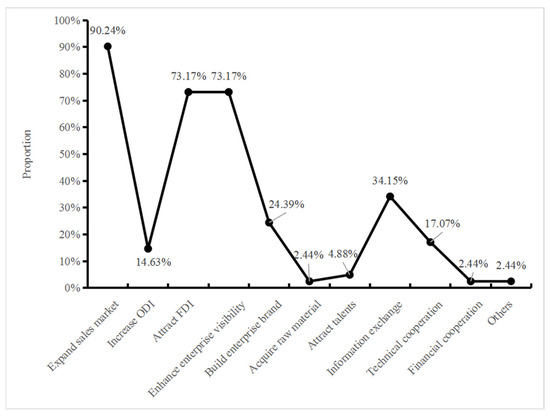 The purpose of Yinchuan enterprises participating in the China-Arab States Expo can be divided into three levels (Figure 4): ① Main purpose. It mainly includes expanding the sales market, attracting investment, and enhancing their corporate reputation. It can be seen that Yinchuan enterprises hope to attract investment and enhance the corporate reputation through the China-Arab Expo and at the same time they want to use this international platform to develop domestic and foreign sales markets. ② Secondary purpose. It mainly includes information exchange, corporate brand building, and technical cooperation, which reflects that the China-Arab States Expo is a platform for gathering information and technology. Enterprises hope to enhance their core competitiveness through information and technology exchanges and cooperation, so as to build an influential corporate brand. ③ Less important purpose. It mainly includes increasing foreign investment, attracting talents, acquiring raw materials, financial cooperation, and others. On the one hand, the development of the enterprise itself is limited, such as less foreign business, low demand for raw materials, and a low level of financial cooperation. There are still deficiencies in promoting local enterprises to “go global”, attracting talents and financial cooperation. A platform to go global, but due to the poor development of the companies themselves, some companies still have little contact with foreign countries. Our companies have very little foreign investment, their competitive advantages are not obvious, and the benefits of foreign investment are relatively poor. Originally in the West, the attractiveness of talents in the region was relatively low, which cannot be changed by an exposition. Islamic finance in Arab countries is influenced by Islamic teachings and there are many difficulties in financial cooperation with other countries, which will affect the foreign cooperation of enterprises.