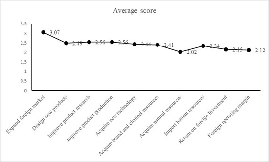 The Likert scale was used to quantify the motivations and benefits of local exhibitors’ participation in the global division of labor, in order to explore the driving force of enterprises’ participation in globalization. The results show that (Figure 5), except for “expanding foreign markets”, the average scores of the other options are all lower than 3 (1—very unimportant, 2—somewhat unimportant, 3—average, 4—somewhat important, 5—very important). This shows that the driving force of Yinchuan enterprises to participate in globalization is relatively simple: it is mainly to expand foreign markets. The return on foreign investment and the profit rate of foreign sales are low and the globalization efficiency of enterprises are poor. For a long time and for various reasons such as geography, history, politics, economy, ideology, etc., the ability of enterprises in the DICWC to participate in the global division of labor was always weak and the ability of enterprises to attract external resources was poor, which in turn led to the ability to participate in the global division of labor. Further weakening produces the Matthew effect of “the weak get weaker”. A person in charge of a steel casting manufacturing enterprise in Yinchuan City (questionnaire No. 38, middle-level leader) said: “Everyone still wants to make enterprise bigger, especially in recent years, the problem of overcapacity in China is serious, and it is certainly a good solution to open up foreign markets. Our company, of course, also wants to obtain foreign technology and funds, but people are unwilling to come. Our market, technology, management, and talents are not as good as those in the eastern region. We can only rely on our own resource advantages to open up foreign markets, now the environmental protection requirements are high, and enterprises have to transform, and they need advanced technology, equipment and financial support”.