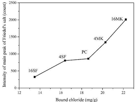 Chemical binding is generally attributed to Friedel’s salt formation, mainly from the Tricalcium Aluminate (C3A) phase of Portland cement and reactive alumina of SCMs (see Table 1) [31,46,61,63,64]. The use of clays, such as MK, increases alumina, ferric oxide, and monosulfate (AFm) phases due to the high amount of aluminum ions during early cement hydration reactions. AFm phases can contribute to chemical chloride binding via the conversion to Friedel’s salt through a chloride anion exchange [31,46,64,65,66,67]. In this regard, Gue et al. [31] showed a linear relation between chemically bound chloride and Friedel’s salt intensity in SF and MK-containing pastes (see Figure 1). There are two main formation mechanisms of Friedel’s salt, namely adsorption and anion exchange. In adsorption and anion exchange, Na2+ and OH− are released, respectively [44,68]; thus, chloride binding affects the chemistry of pore solution and increases its pH [44,67,68,69].