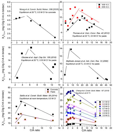 Relationship between chloride-binding capacity and CaO to Al2O3 (C/A) ratio of binder. Adapted with permission from Ref. [38].