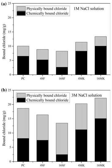 The amounts of physically and chemically bound chlorides in cement pastes after equilibrium binding in NaCl solutions. (a) 1 mol/L NaCl solution; (b) 3 mol/L NaCl solution (PC: Portland cement paste; 4SF: paste containing 4% of SF; 16SF: paste containing 16% of SF; 4MK: paste containing 4% of MK; 16MK: paste containing 16% of MK). Adapted with permission from Ref. [31].