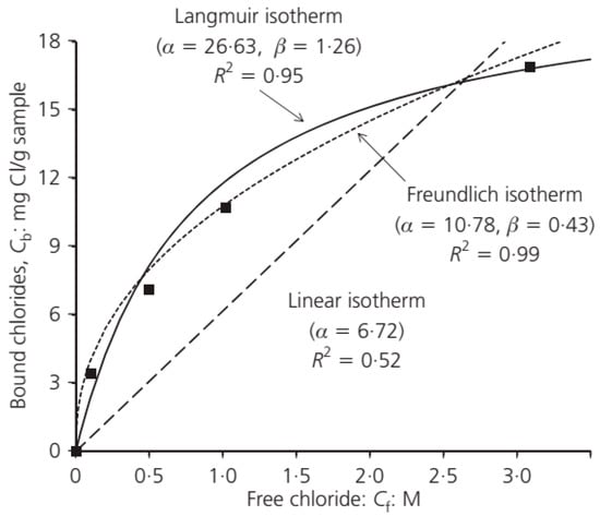 In general, recent findings have confirmed the acceptable accuracy of Langmuir and Freundlich isotherms to represent the chloride binding of OPC-MK materials [38,80,81,82,83]. The linear isotherm is oversimplified to indicate the relation between free and bind chloride in real cases [38,44,84] and has more accuracy in chloride concentrations below 20 kg/m3 and over long-term periods (10–30 years) [84]. The Langmuir isotherm has an acceptable accuracy in low chloride concentrations, and the BET isotherm is rarely used due to its complexity. The Freundlich isotherm seems the most approximate in normal seawater [44]. It has been reported that choosing a binding isotherm critically affects service life prediction [85]. As can be observed in Figure 4, Dousti and Shekarchi [86] described the non-linear behavior of both the Langmuir and Freundlich isotherms as matching experimental data on experimental bound and free chloride concentrations with a coefficient of discrimination (R2) of 0.95 and 0.99, respectively. These results were extrapolated for other concrete materials of varying formulations and it was found that the Freundlich isotherm provides a better fit than other isotherms (see Figure 5). Importantly for these results, the variables of the Freundlich isotherm (α and β) were demonstrated to be a function of temperature as well as cementing material type. Note that α and β have no physical meaning and also depend on the units of Cb and Cf [44].
