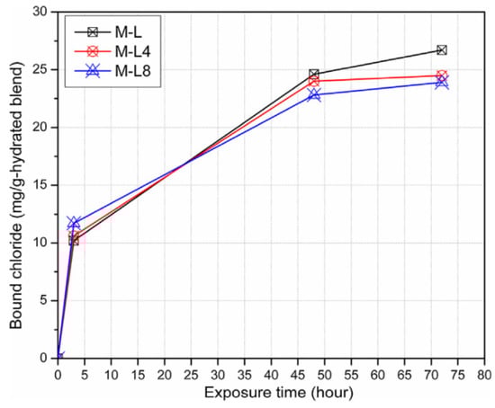 Chloride-binding content during exposure (MK-Lime (M-L) paste and 0%, 4%, 8% gypsum). Adapted with permission from Ref. [68].