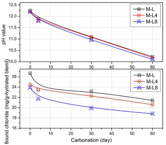 Bound chloride and PH value of exposure solution during carbonation (MK-lime (M-L) paste and 0, 4, 8% gypsum). Adapted with permission from Ref. [68].