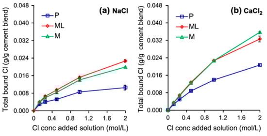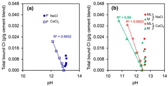 Relationship between the total bound chloride and the pH of the exposure solutions for (a) Portland cement (P) paste and (b) the metakaolin-limestone (ML) and metakaolin (M) pastes exposed to the NaCl and CaCl2 solutions. Adapted with permission from Ref. [50].