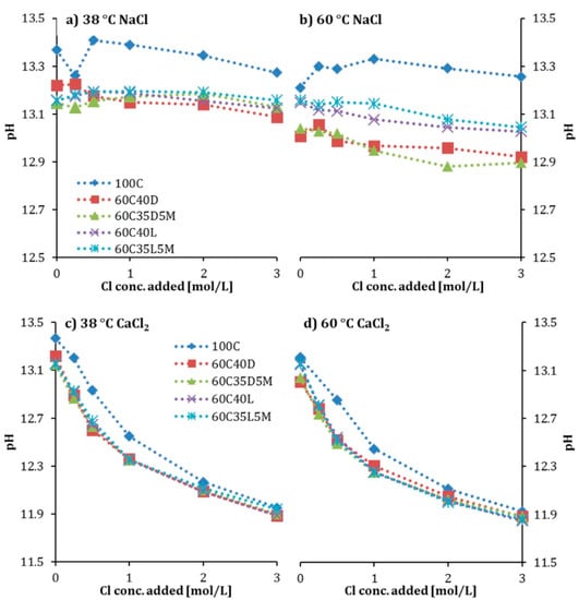 pH measurements of the supernatant of the various binder compositions cured at 38 °C or 60 °C and exposed to various concentrations of NaCl or CaCl2. The measurements were performed at 20 °C. The points at 0 mol/L refer to the pH measurements of the reference samples exposed to deionized water. Adapted with permission from Ref. [89].