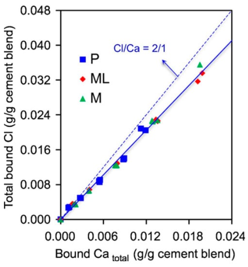 Relationship between the total bound chloride and the total “bound” calcium (i.e., uptake of calcium from the CaCl2 exposure solution by hydration products) for pastes exposed to the CaCl2 solution. Adapted with permission from Ref. [50].