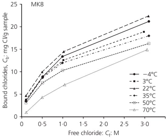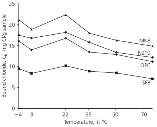 Effect of temperature on bound chloride content for different mixtures (Ci = 3 M). Adapted with permission from Ref. [86].