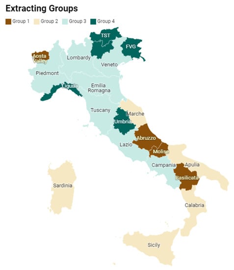 - Group 1: Abruzzo, Aosta Valley, Basilicata, and Molise. This group is characterized by almost all of the smallest mean values. The regions of this group are the least densely populated, have the coldest temperatures, and, on average, receive less rain than those in groups 3 and 4; moreover, these regions have the smallest values of production and waste with respect to the other groups.