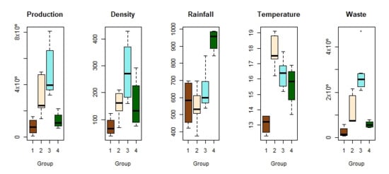 Providing a profile for each of the four groups is critical for recognizing similarities and differences across the groups regarding the factors that may enable bioelectricity production. Table 1 reports the different means of the grouping variables employed, and Figure 3 shows boxplots that help one appreciate the distribution of these variables.