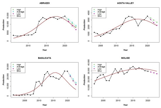 This group was composed of the most recent regions to start producing bioelectricity. Specifically, Abruzzo started in 2006, Aosta Valley in 2003, Molise in 2002, and Basilicata in 2001. From Table 2, it emerged that three of the four regions of this group had the highest values of p (Abruzzo, Aosta Valley, and Molise). The reason for these high p values was the fast-increasing trend in the early stages of the series. This would suggest that these regions experienced a faster take-off in bioelectricity production (but starting later than other regions) by taking inspiration from the successfully adopted solutions and policies implemented by the other regions of Italy.