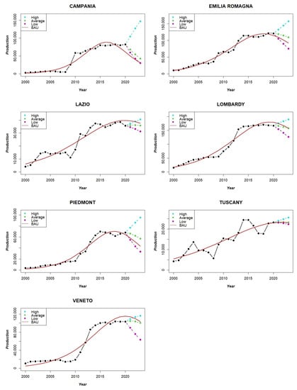In detail, starting from 2006, the yearly evolution of each regional series was analyzed through a careful analysis of the estimated Bass model parameters (i.e., p and q) by first calculating the yearly rates of change of these parameters and then connecting them with the regional policies, whose details are provided by GSE [58]. In this way, the variations in the parameters could provide an indication of the intensity of a policy action. Then, by inspecting the graphical trajectories of each region and considering the regional policies enacted, the significant yearly variations in the most likely policy scenario (high, average, low) were assigned. A thorough description of the scenario method, along with the variations employed for each regional policy scenario, are reported in Appendix A. In what follows, the results are presented for each group in order to identify common traits and differences in the predictions between regions with similar regional electricity production.