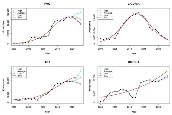 Looking at the scenario simulations in Figure 7, Friuli–Venezia Giulia and Trentino–South Tirol showed results that were sensitive to the choices made. However, Umbria and Liguria had particular situations. The first was characterized by an increase regardless of the type of policy implemented, and the second was characterized by a decrease. Liguria seemed to have left this type of technology; in fact, the forecasts were pessimistic even if we simulated a strong policy scenario. So, in this region, a rethinking of objectives regarding bioelectricity diffusion would be necessary, as probably occurred in Umbria between 2010 and 2012. After this drop, Umbria started a positive trend that will likely continue in the following years, as confirmed by the simulations.