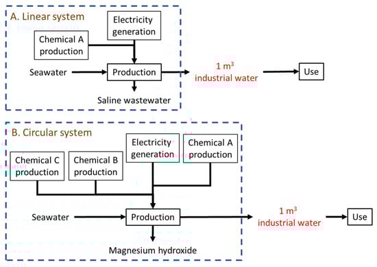 The case study is hypothetical and was used to investigate the interpretation of the S-LCA results. The case study considered an assumptive industrial water production plant (called “linear plant” for the rest of the study) in Rotterdam, The Netherlands, which treats seawater with reverse osmosis. This is a typical linear economic process that consumes electricity and chemicals during operation. The reverse osmosis process produces wastewater that is disposed to the sea. The second hypothetical plant (called “circular plant” for the rest of the study) also produces industrial water and aims to replace the linear plant. The circular plant incorporates circular economy aspects to eliminate the saline wastewater disposal while aiming to recover magnesium at the same time, in the form of magnesium hydroxide. For this purpose, the circular plant employs higher amounts of chemicals and electricity.