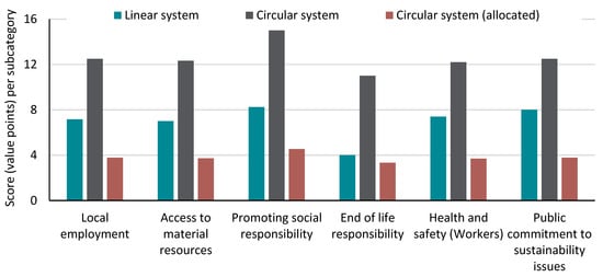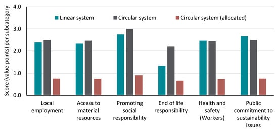 Figure 2 presents the aggregated results by using subcategories. The circular system consists of more organizations than the linear system. Therefore, if the results are not normalized by the number of organizations, the circular system is expected to result in worse social performance. This would be the case even if all organizations were scored with a score value = 1 (i.e., going beyond corporate responsibility).