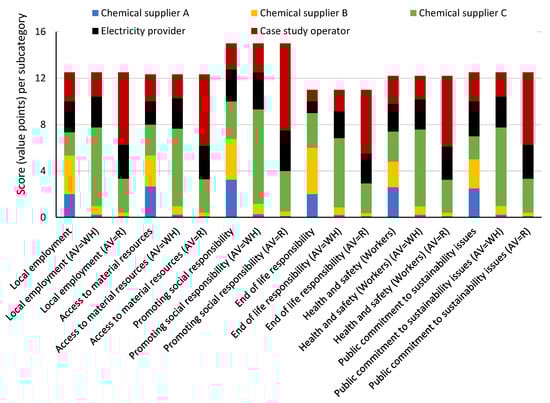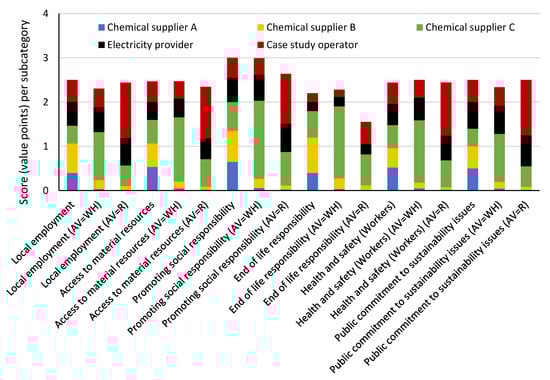 Figure 4 shows the aggregated results when weighting factors are applied to the characterized data of each organization in the circular system. Weighting resulted in an impact score very close to the averaged results (Figure 3) because it was applied to the characterized organizational data which range from A = 1 to D = 4. However, the total value scores are different in Figure 3 and Figure 4. Choosing to apply weighting to the characterized data is based on the assumption that the “real” SAM results are the social performance per organization and subcategory, such as a score of B = 2 for Chemical supplier A for “End-of-life responsibility”. In this case, the aggregated value scores change, and the contribution of the organizations involved changes, depending on not only the weighting factors but on the organizations’ characterization data as well. For instance, the weighting factors based on working hours for Chemical supplier C and Electricity provider were 54% and 21%, respectively, but in the case of “End-of-life responsibility” their contributions were 71% and 9%, respectively. Therefore, their contribution to the S-LCA results is not necessarily greater than from when assuming equal weights.