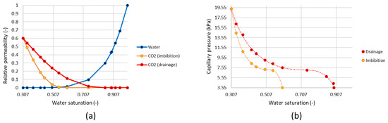 The relative permeability curves were calculated according to the Corey–Brooks method [56], using the following exponents and endpoints from the literature: NW = 5 [57], NCO2 = 2 [58], Swi = 0.307, Sgc = 0.106, and Sghys = 0.4 [59]. The capillary pressure curves were also taken from the experimental data reported in the literature [60]. The relative permeability and capillary pressure curves are shown in Figure 1.