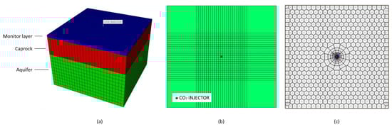 The porosity and the permeability of the caprock were set to be equal to 20% and 10−7 mD, respectively [53]. The porosity and permeability of the monitoring layer were set to be equal to those of the aquifer (Table 1).
